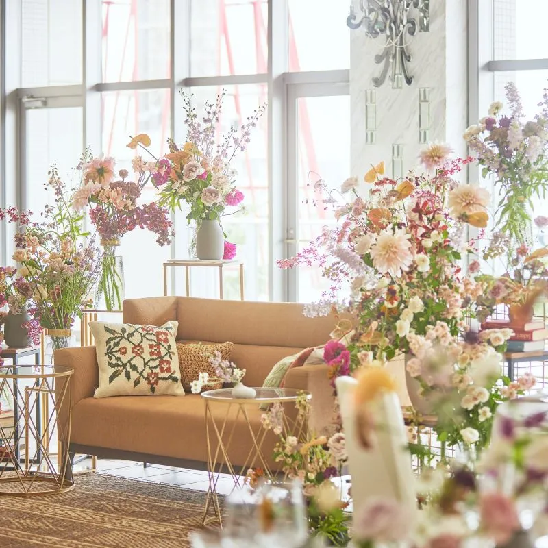 【専属フローリストによる会場デザイン】旧居留地にフラワーショップも構えるフローリストが手掛けるテーブルコーディネートを体験いただけます。パーティテーマに合わせたテーブルクロスやペーパーアイテムも必見。